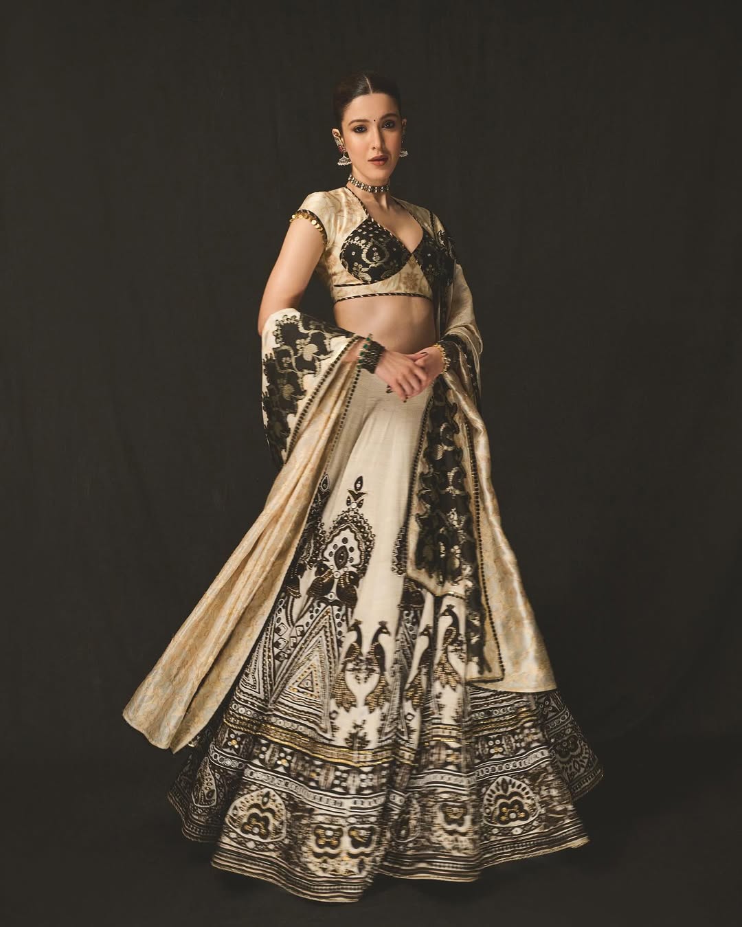 When minimalism meets Indian craft, you get a clean, aesthetic silhouette that turns into an heirloom piece. Shanaya’s ivory and black Kutch-embroidered lehenga is the official it-girl uniform for summer weddings in 2026. Featuring a zari banarasi dupatta with applique and mirrorwork, the embroidery highlights geometric patterns in ikkat and patan patola crafts.