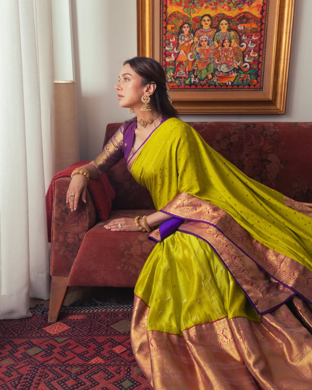 Sonam’s fashion has always been the talk of the town, and her maternity fashion has been stealing the spotlight! Staying true to her style, Sonam recently wore a pista and old rose Baluchari saree featuring a traditional Kalamkari print, giving us one of the best Bollywood traditional looks of 2026. It is inspired by a 19th-century piece at the Met, and Sonam styled her maximalist look with a side dupatta and contrasting layered jewellery.