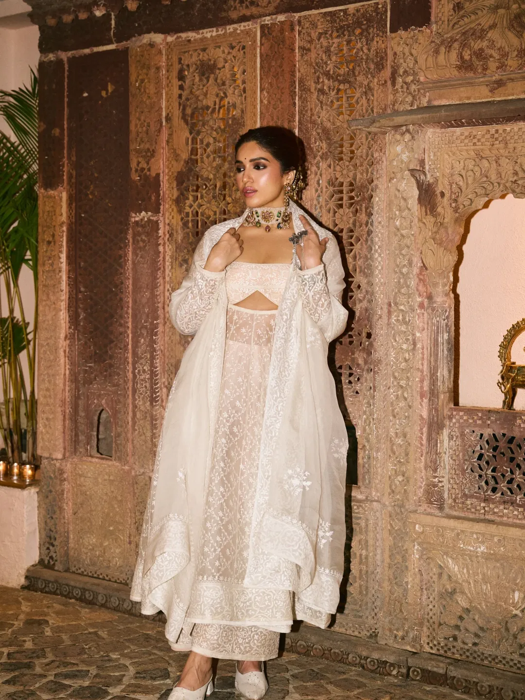 Chikankari is a traditional, classic, and timeless embroidery that looks ethereal, no matter how it is styled. And Bhumi Pednekar just gave it an edgy and sexy spin when she stepped out in a white Chikankari angrakha choga. The suit has an open front with a bandeau-style top and layers of sheer organza, giving it a fresh, bold, and unapologetically desi appeal. BRB, bookmarking this Bollywood traditional look for the 2026 wedding season.