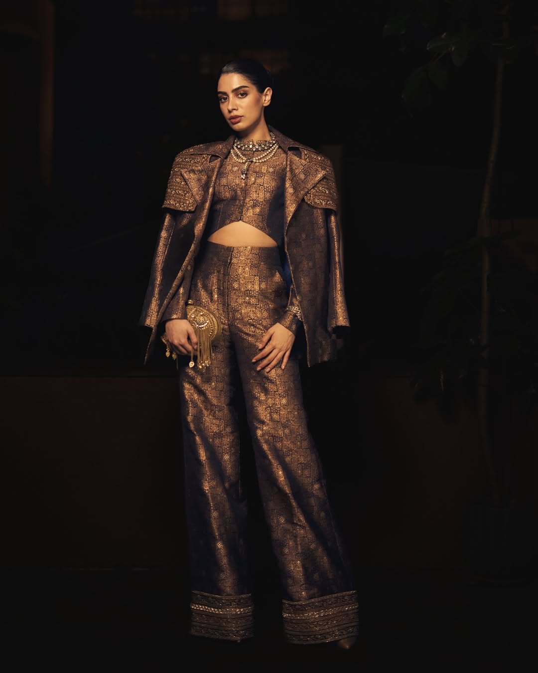 Who says rich brocade is just for the sarees and lehengas? Khushi Kapoor turned heads in this sharp, bold, and powerful brown brocade pantsuit. It is delicate, chic, and young but still rooted in culture, and that’s exactly why it screams for attention. So, if you’re in the mood to give your heirloom a modern and tailored twist, save this look and create your own version of it.