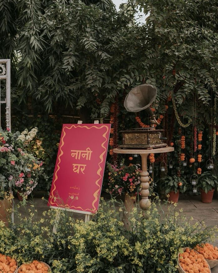 Do you want your guests to feel more at home at your mehendi ceremony? Give your regular mehendi function a nostalgic twist with the nani ka ghar theme. Keep some engaging games, including carrom board and hopscotch (stapu). You can replace the seating with chaarpaais. For the décor, you can keep some paper fans hanging around, jars of old-school sweets, and even a bioscope peeking through. Guests will instantly slow down, settle in, and start reminiscing about childhood summers. It will also keep the children engaged while the elders get their mehendi done fuss-free.