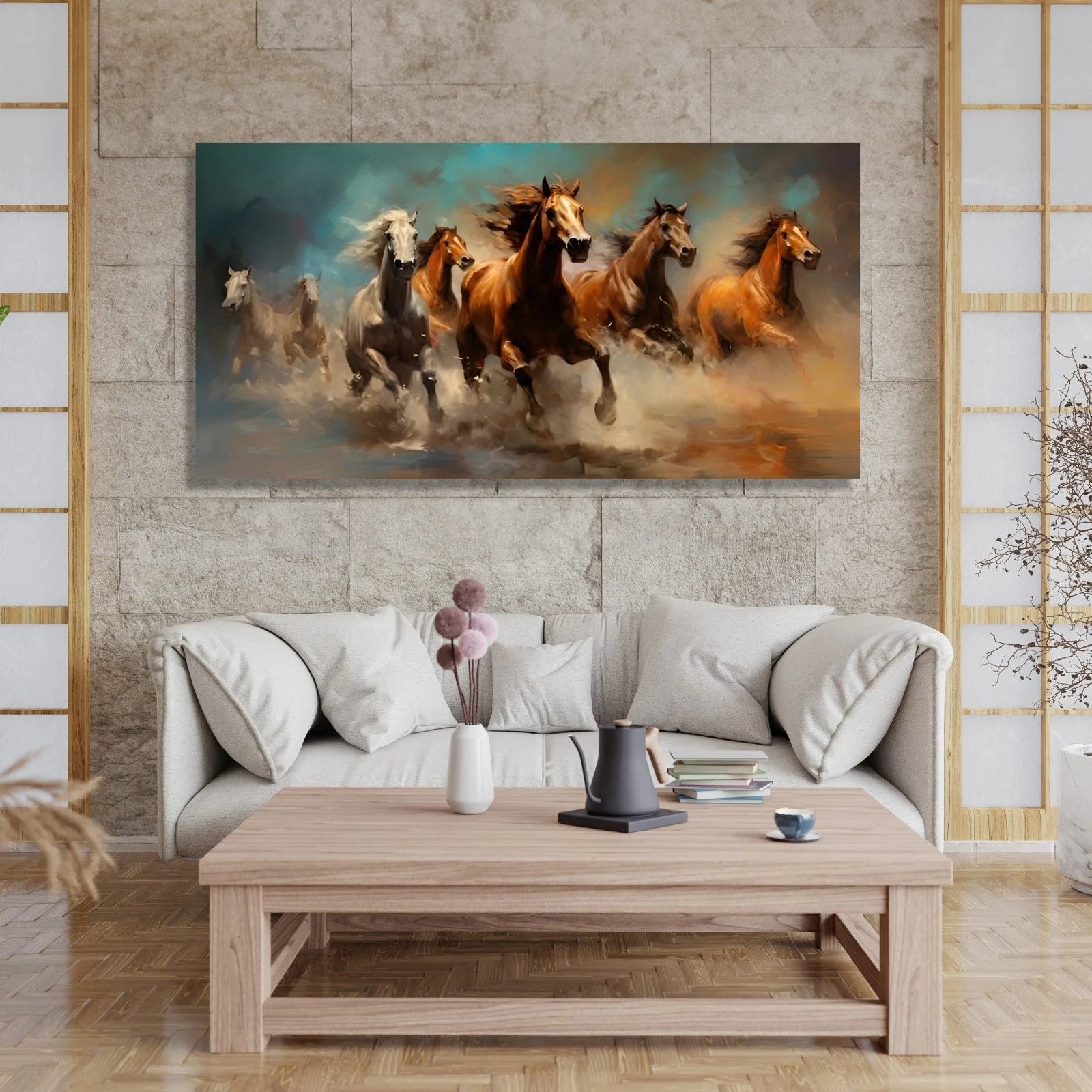 In Vastu, the seven horses painting blends colour, motion, and symbolism. “The dynamic energy of galloping horses represents speed and progress,” Anchal says. Also, numerology associates the number ‘seven’ with harmony which aligns with universal energy. When all these elements are combined together and the painting is placed in an ideal Vastu zone, the artwork brings momentum, growth, and success to that space.